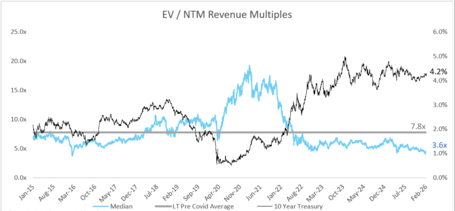 The median EV/NTM revenue multiples of software companies are now at a 10-year low of 3.6x.